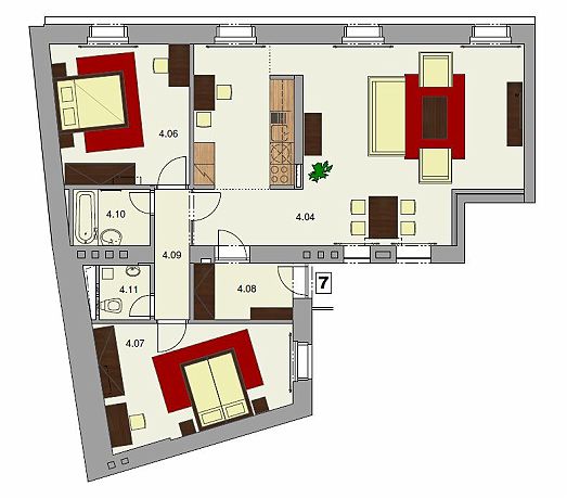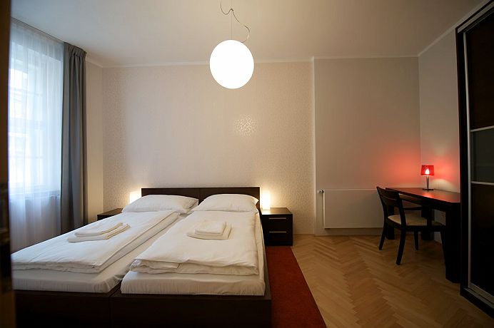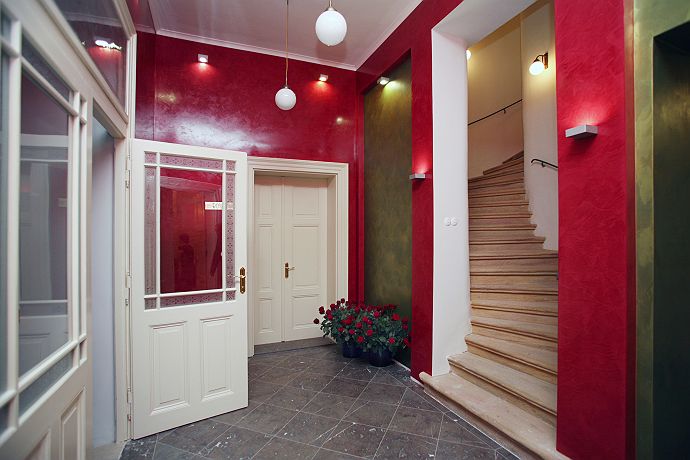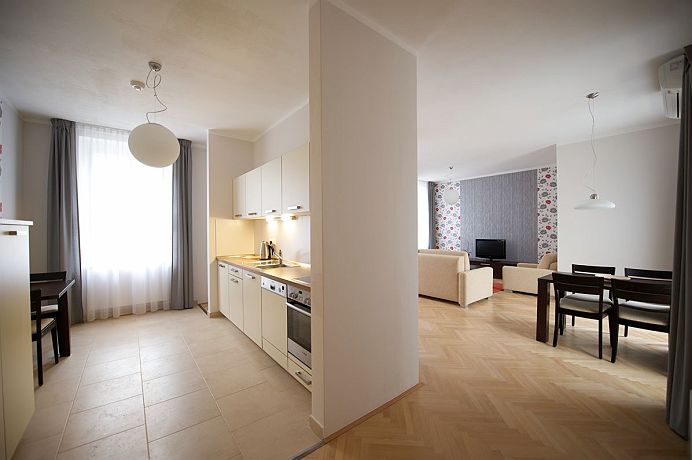 Apartment No.7 combining elegance and timeless design. This apartment has 97 sqm. All apartments represent a suitable place for spending a family holiday in one of the most beautiful European capitals as well as for creating a temporary home if staying longer. Having only 10 apartments in the building ensures maximum privacy. For the comfort of guests all apartments are fully equipped: Wi-Fi internet, SAT TV, LCD TV, air condition, kitchen unit with dishes and Bosch appliances (refrigerator with freezer, glass ceramic hob, oven, dish washer, microwave, kettle, Nespresso coffee maker), bathroom with bath and glass curtain, washing machine, safe, iron, ironing board, hair-dryer, bed and bath linens, house phone. Residence Ostrovni is guarded by a camera surveillance system. All interior premises are non-smoking. The rental price includes the following services: All equipment, Wi-fi, SAT TV, bed and bath-linen exchange in case of minimum 7 nights stay, technical maintenance. Residence Ostrovni is favorite not only for its excellent position, but also thanks to family atmosphere and art of hospitality.