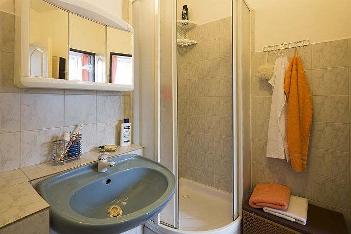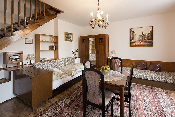 Cosy apt ideal for 2-3 people. The wooden staircase is a dominating feature of a living room. The apartment is 40sqm large and it easily accomodates 3 people (folding sofa and single bed). It is possible to interconnect with another apartment (Apartment in the Attic, + 6 people). The apartment has a private kitchen and a private bathroom with toilet. Our Apartments At the Cats are 10 minutes walking distance from centre, on the river bank, just beside a cycloroute and next to the Garnet rock. Situated under Kotnov. Parking is possible in front of the house or at a parking place behind the river (about 50m away). Apart from a free wifi you will have at your disposal an outdoor swimming pool, a terrace, a grill and recently we lend our bikes (fee is optional, normal wear and tear). We do not provide a classical breakfast, but you will have plenty of food at your disposal and you can decide what and when you want to eat. There will be various things from tea/coffee/milk, bread and rolls, vegetable/fruit, muesli, yoghurt, ham, cheese etc.
